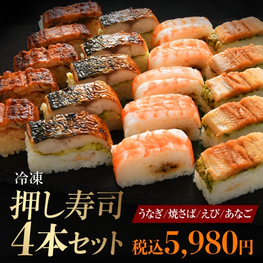 | 原材料 | 《うなぎ押し寿司》米(国産)、うなぎ蒲焼、うなぎ加工品(うなぎ、醤油、みりん、その他)、合わせ酢、植物性油脂/調味料(アミノ酸等)、酸味料、酒精、増粘剤(加工澱粉、増粘多糖類)、着色料(カラメル、アナトー)、(一部に小麦・大豆・ゼラチンを含む) 《焼さば押し寿司》米(国産)、焼さば、甘酢生姜、味付昆布、合わせ酢、植物性油脂/調味料(アミノ酸等)、 酸味料、甘味料(サッカリンNa、ステビア)、ソルビット、保存料(ソルビン酸K)、(一部に小麦、さば、大豆、ゼラチンを含む) 《えび押し寿司》米(国産)、えび、中具(干し椎茸、干瓢、砂糖、その他)、合わせ酢、植物性油脂 / 調味料(アミノ酸等)、酸味料、カラメル色素、(一部にえび・大豆・ゼラチン・小麦を含む) 《あなご押し寿司》米(国産)、煮穴子(真あなご、砂糖、醤油、その他)、甘酢生姜、味付昆布、合わせ酢、植物性油脂 /調味料(アミノ酸等)、酸味料、甘味料(サッカリンNa、ステビア) 、ソルビット、保存料(ソルビン酸K)、(一部に大豆・小麦・ゼラチンを含む) |