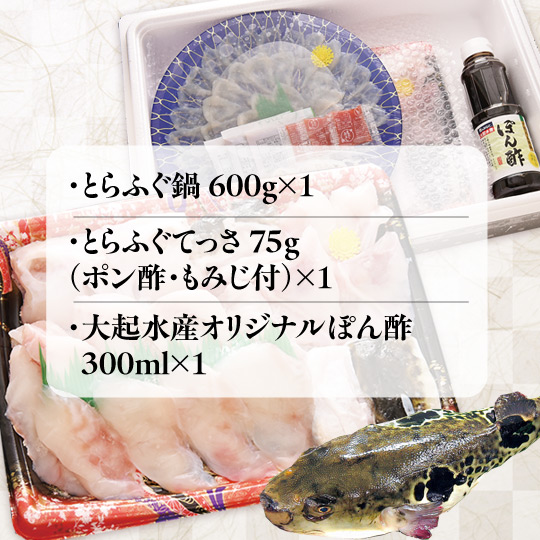 | 内容量 | 3人前(とらふぐ鍋600g×1・とらふぐてっさ75g(ポン酢・もみじ付)×1・大起水産オリジナルぽん酢300ml×1) | |