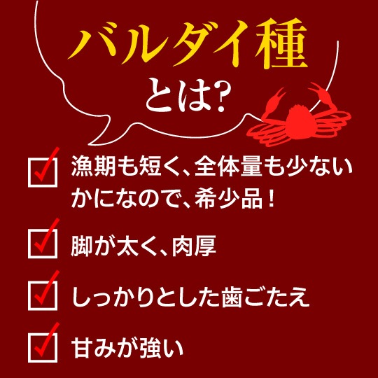 | バルダイ種とは | ロシア海域にてシーズ物で希少価値のあるバルダイ種です。 ここ近年禁漁が続いた中、解禁されたものを早めにキャッチし、 原料の身質等検品を重ね買い付けしたものです。 身質は肉厚が特徴で足が短い分太脚が特徴です。 |