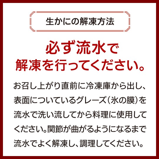 | 生かにの解凍方法 | 必ず流水で解凍を行ってください。 お召し上がり直前に冷凍庫から出し、表面についている グレーズ (氷の膜)を 流水で洗い流してから料理に使用してください。 箱がに (肩付きがに) の場合は、関節が曲がるようになるまで 流水でよく解凍し調理してください。 |